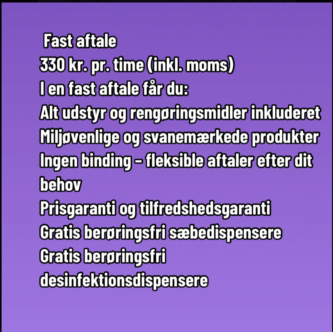 Uanset om du vælger privatrengøring, erhvervsrengøring eller sommerhusrengøring, er vores mål at skabe et rent, sundt og indbydende miljø for beboere, kunder og gæster.