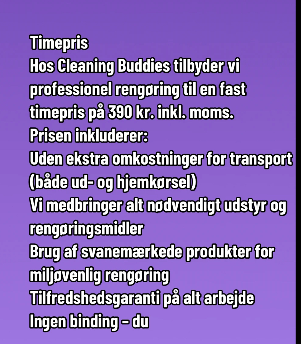 Hos Cleaning Buddies lægger vi vægt på kvalitet, fleksibilitet og gennemsigtige priser – og vi bruger altid effektive, men skånsomme rengøringsmidler.